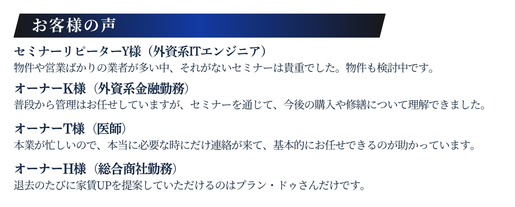 今後はトランプ大統領の利下げ方針やFRBの運営にも注目が集まりますが、ますます経済的格差が広がっていくことが予想されます。このような状況下で、インフレ対策かつ、レバレッジ資産として、オーナー様からの需要のみならず、金融機関目線としても不動産投資を貴重なビジネスチャンスとして捉えていると感じています。